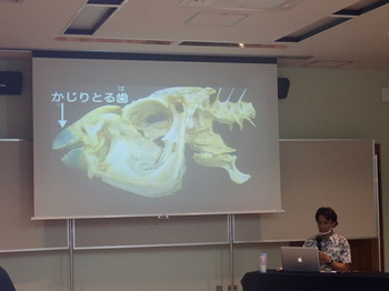 サンゴにちなんだ講演として、水産総合技術研究所の名波さんを講師にお迎えし、サンゴ礁を住処とし、サンゴをエサとする魚の生態についてお話くださいました。