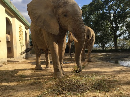 アフリカゾウのマリーとエリは、普段は、乾燥した野草をたべているので、生の新鮮な野草を食べてもらうために、校区内の草原に移動しました。