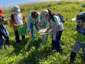 特別に許可をもらって草原に入りました。植物観察では、リンドウやウメバチソウなど、約20種類の草花を見つけることができました。