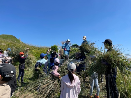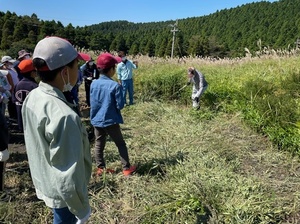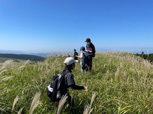 さて今回は、草原環境学習プログラムを紹介します。熊本市動植物園さんに協力いただき、阿蘇地域の小学校を対象に平成28年から体験学習に取り組んでいます。今年も、阿蘇西小学校4年生28人の子ども達を対象に体験学習を行いました。