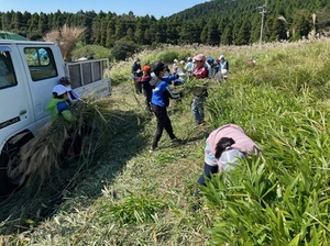 カマの使い方を教わって、草刈りする人・運ぶ人と役割をもって活動しました。