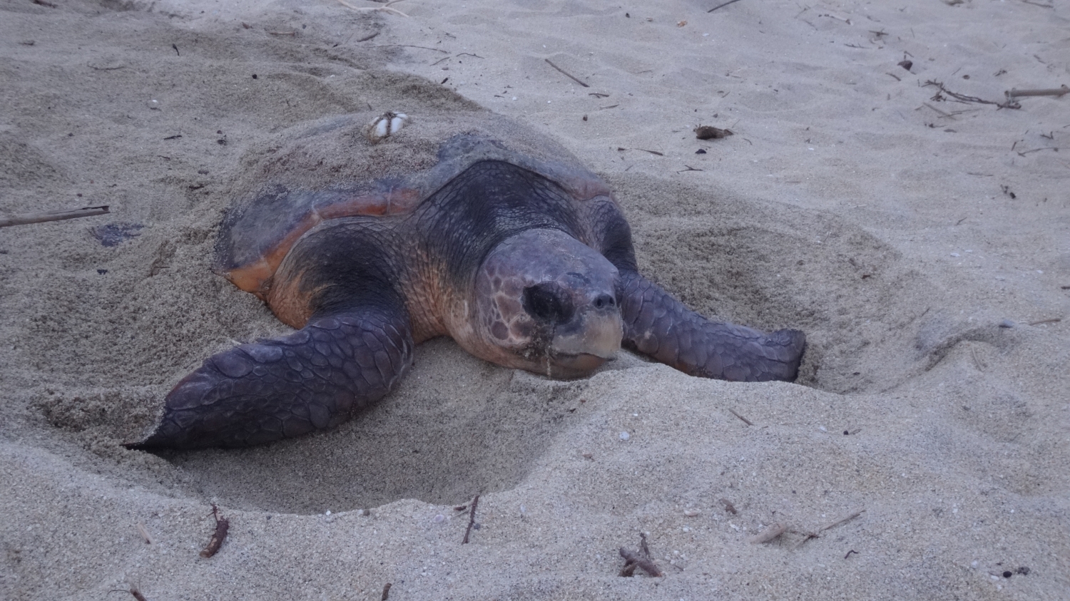 波がかぶらない安全な場所を見つけて、後ろ足を器用に使って深さ約60センチの穴を掘り、100~120個ほどの卵を産み落とします。