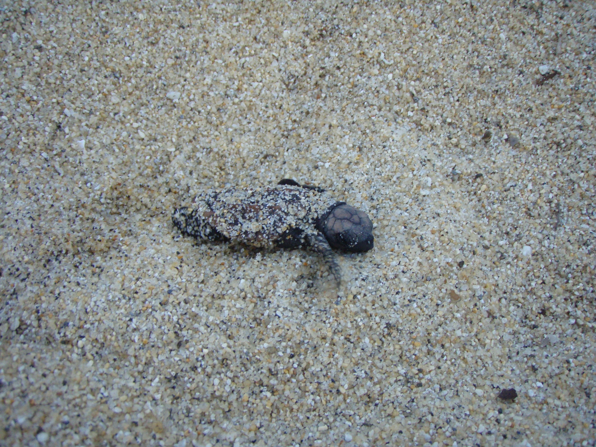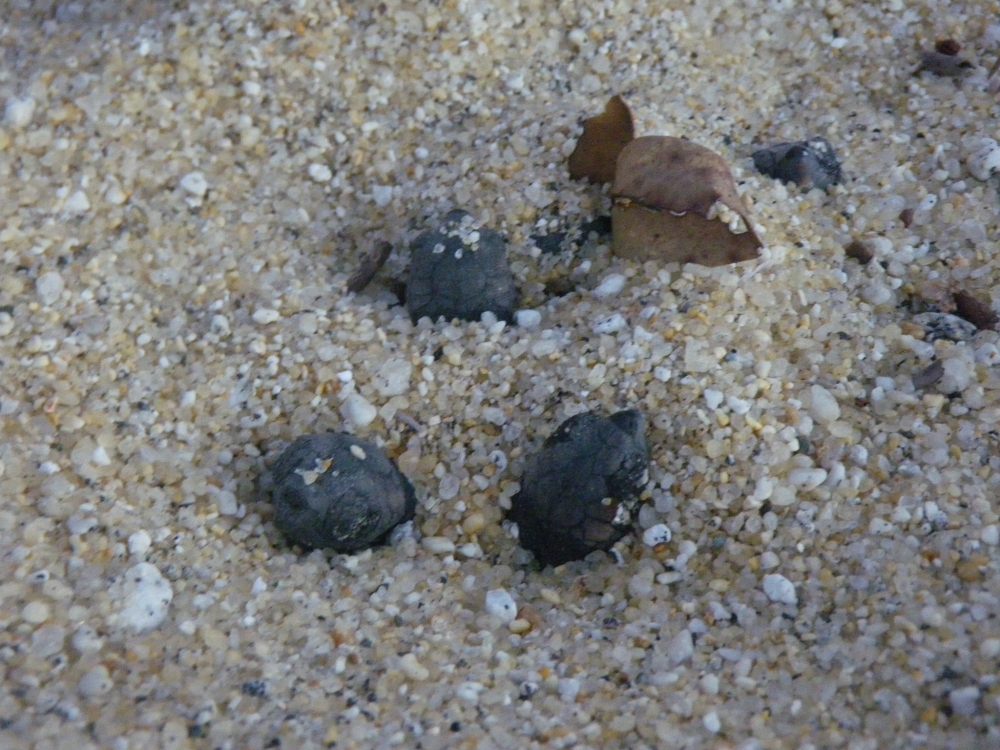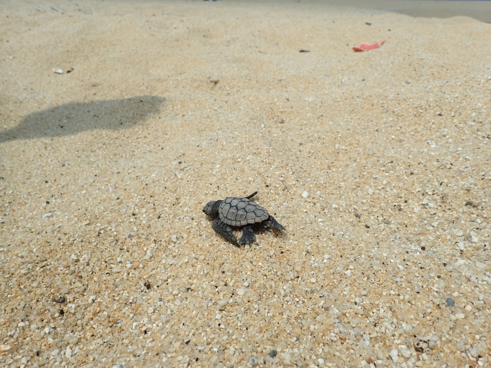 砂から顔を出して休憩している子ガメや、海に向かって歩いている子ガメを広い砂浜で見つけることは非常に困難です。むやみに歩くと子ガメを踏んでしまう可能性があります。