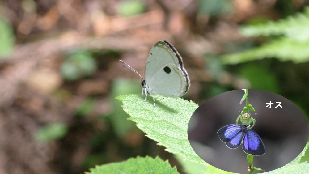 ▲羽の裏側に黒い斑点があり、「ウラボシ」という名前の由来になっている。 ▲オスの羽の表側は光沢のある青紫色