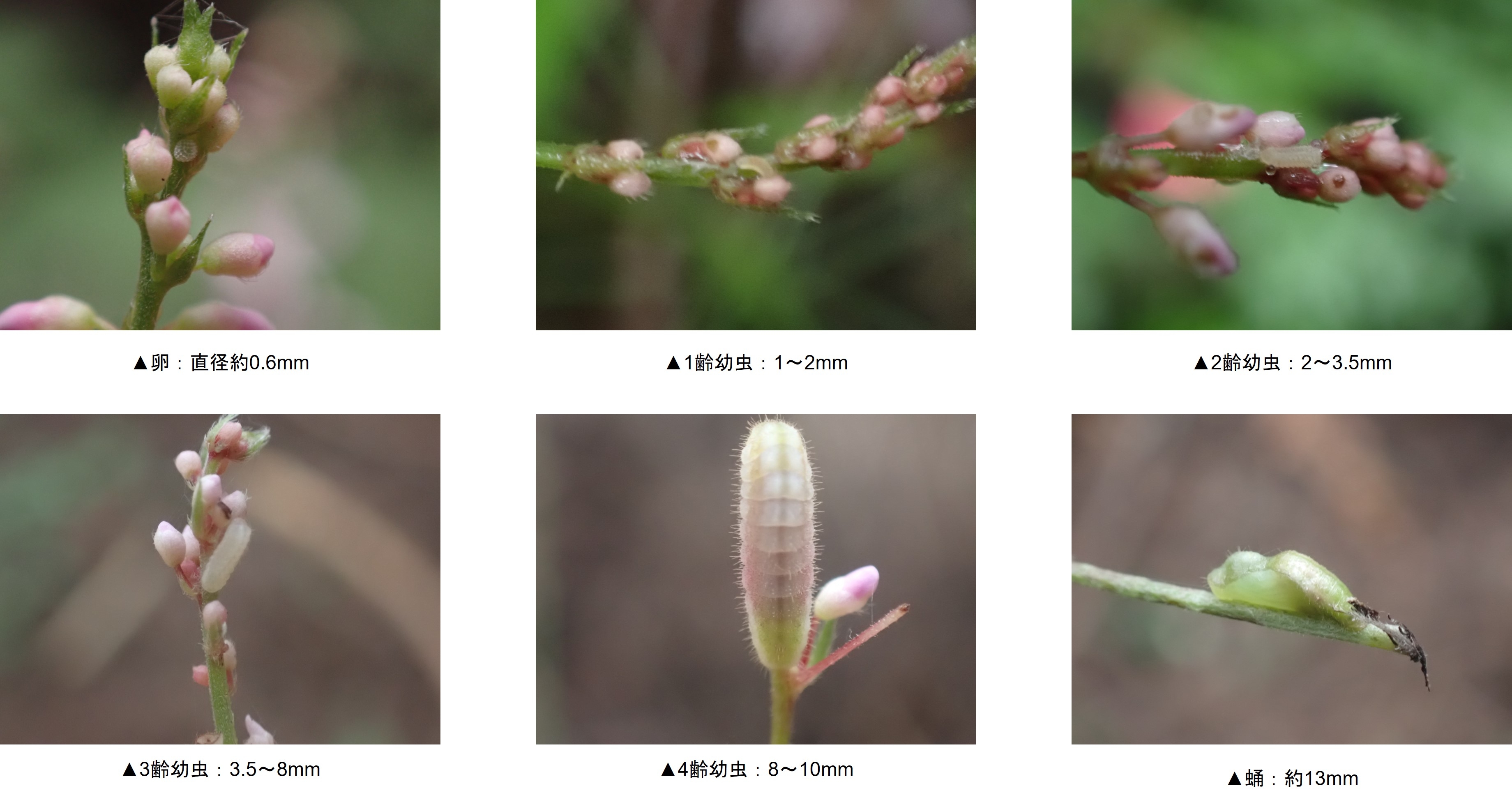 卵 ~ 蛹までの成長段階 幼虫は卵から孵った後、3回の脱皮を繰り返し蛹へと変態します