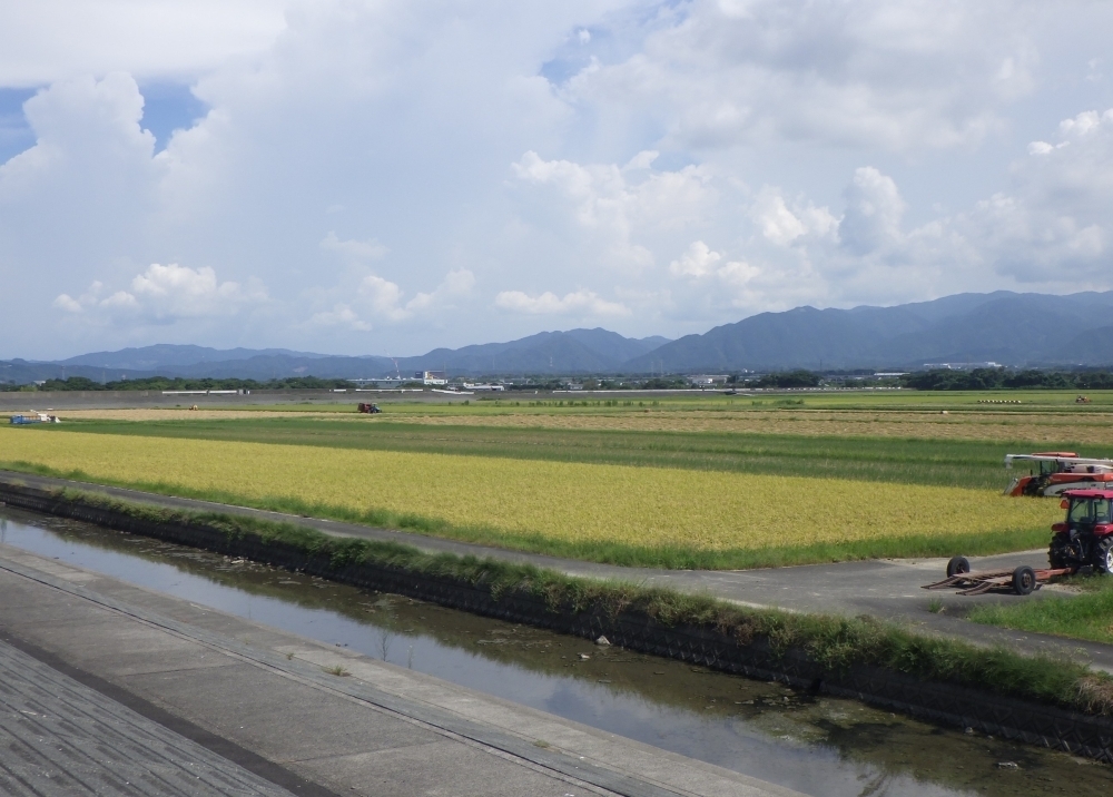 ]ツル飛来地である東干拓の風景です。田園風景というと黄金色に染まった稲穂を想像される方が多いのではないでしょうか。出水では早期米を栽培されている農家さんも多く、早期米は色づき、早いものは店頭に陳列され、待ちに待った新米の時期がやってきました。