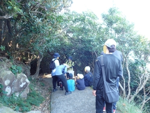 大瀬埼灯台へ向かう途中にヤブツバキの紹介したところ、「あ、実がある!」「種がある!」「あ、これはシカの糞か!」等、参加者の方もいろいろな声が上がりました。