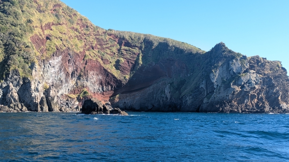 嵯峨島南西海岸にある女岳の火山海食崖は、島南部を形作る女岳の西側半分が東シナ海の荒波により中心部まで浸食された結果できた断崖で、火山の内部構造を観察することができます。
