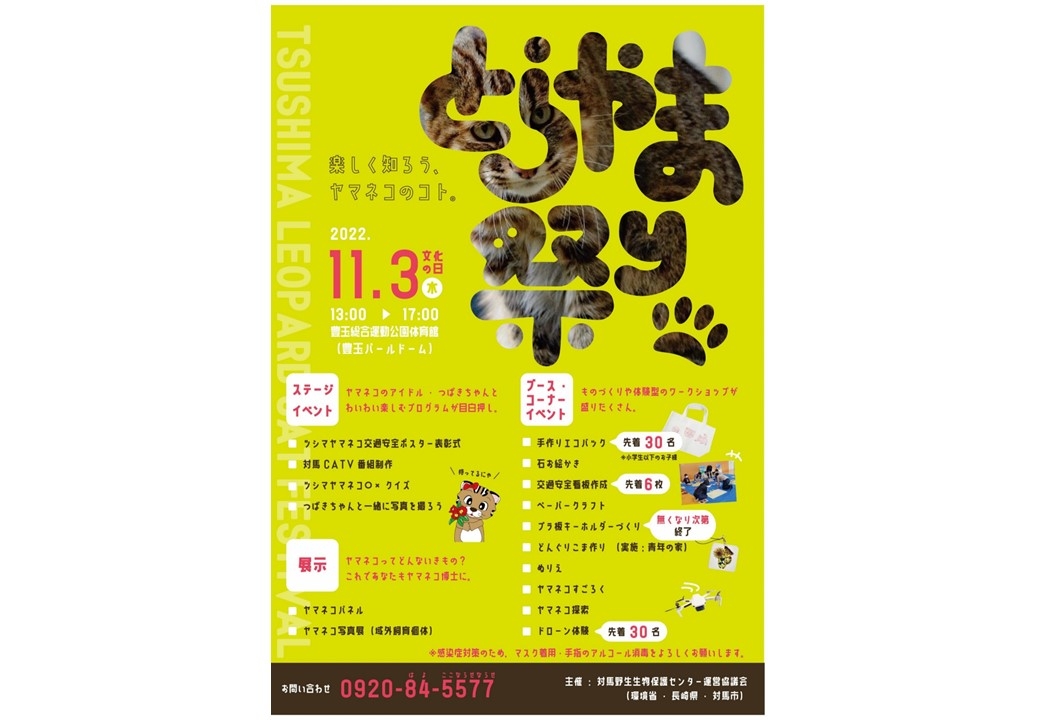 対馬では昔、ツシマヤマネコのことを山にいる虎模様のネコ「とらやま」と呼んでいたそうです。そのとらやまにちなんで10(と)月(ら)8(や)日(ま)を「ツシマヤマネコの日」として制定しており、制定を記念して2015年から「とらやま祭り」と題したイベントを開催しています。ツシマヤマネコを飼育している全国の動物園でも、10月8日をツシマヤマネコとしてイベントなどを行い、ツシマヤマネコを盛り上げてくれています!