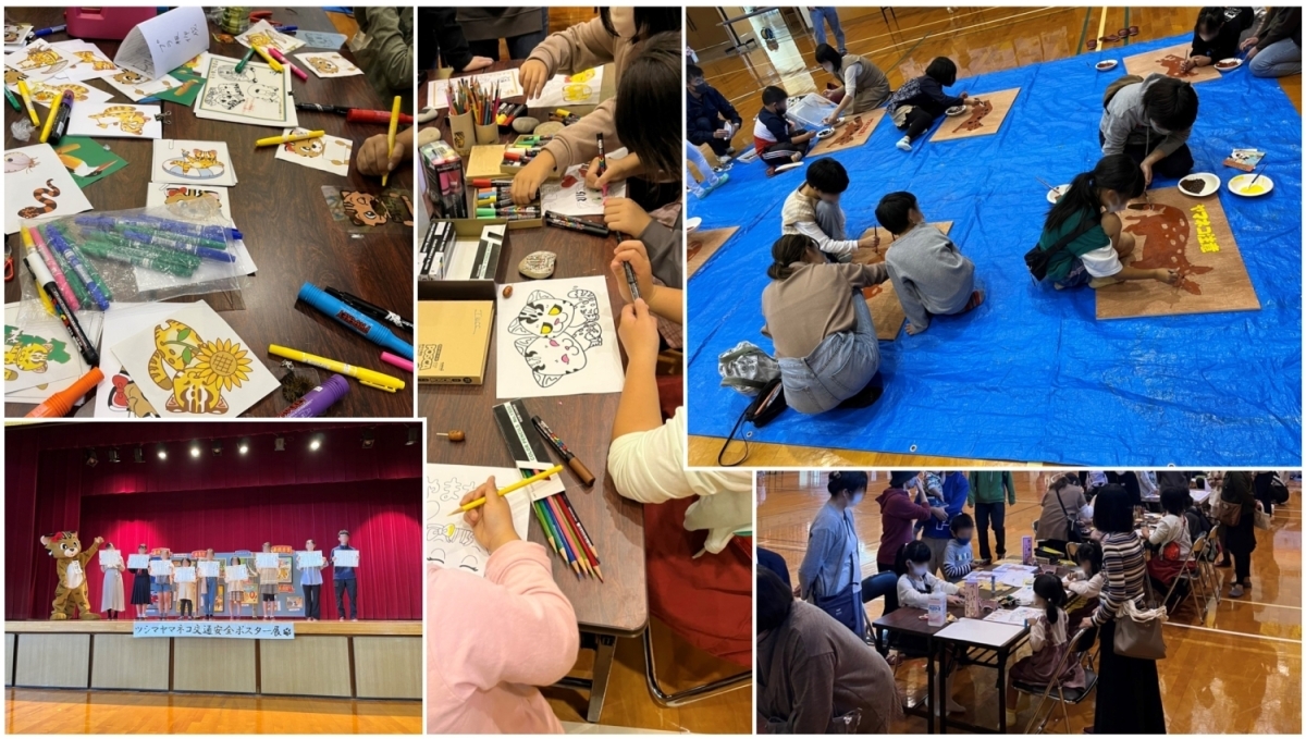 会場ステージでは対馬島内の小・中学校、一般の方たちに募集していた、ツシマヤマネコ交通安全ポスター展の表彰を行いました。今年は例年を上回る199作品もの力作が集まり、見事入選された方にはヤマネコ脱臭炭などヤマネコにちなんだ賞品が贈られました。その他会場ステージでは、対馬市のケーブルテレビ内で放送するツシマヤマネコの交通事故防止を呼びかける番組制作やツシマヤマネコに関する○×クイズを行いました。ブースやコーナーではツシマヤマネコのことを楽しく知れるヤマネコ看板づくりやキーホルダーづくり、ヤマネコの業務を体験できるヤマネコ探索、外来種であるツマアカスズメバチの巣を探索するためのドローンの操縦体験など、どこも盛況で子どもたちの笑い声が絶えない楽しいイベントになりました。