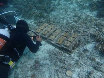 サンゴの一斉産卵がはじまる前に「定着板」というサンゴの赤ちゃんがくっつきやすい板を調査地点に設置してから、約3~4ヶ月後にその「定着板」を引き上げて今年生まれのサンゴ赤ちゃんがどれほど付いているのかを調べます。