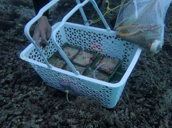 こうして1地点につき5個のコンクリートブロックに各6枚、計30枚をカゴに入れて持ち帰ります。31地点にすると930枚にもなる定着板を詳細に調べていきます。上の写真のように小さなサンゴの赤ちゃんを海の中で数えるのは大変なため、陸上に持ち帰り顕微鏡を使って種類と数を記録します。