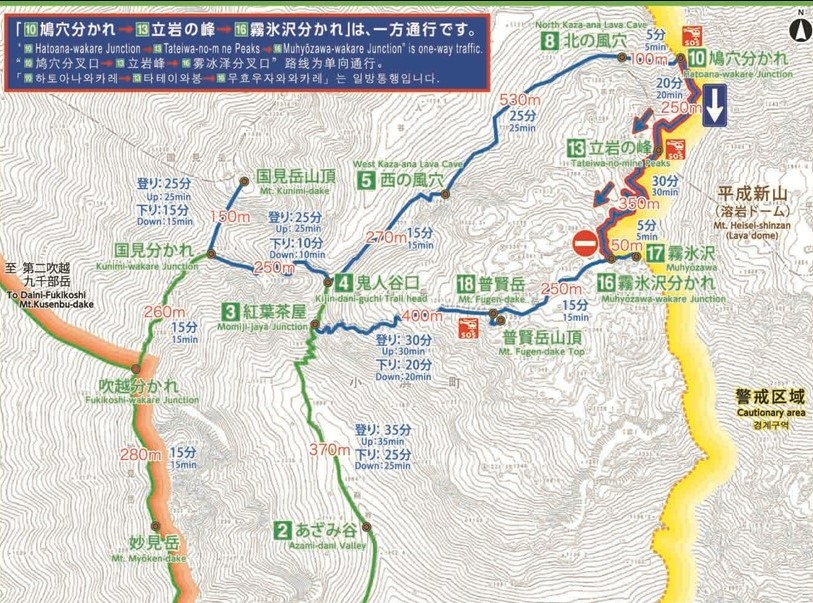 You can see Oyamarenge mainly on the north side of Mt. Fugen. Please make sure of the trail when you go Mt. Fugen, because the trail from “Hatoanawakare” to “Muhyozawa” is only a one-way trail (Please see the map).