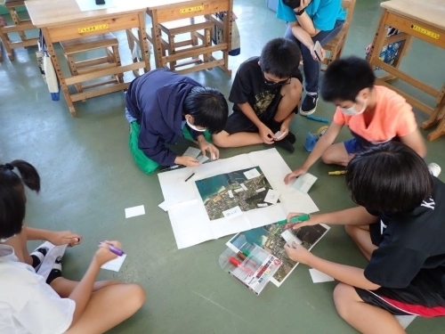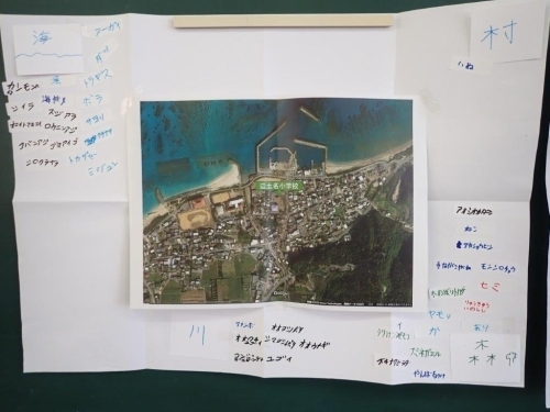 はじめましての第一回は、私たちも緊張しながら教室にむかいました。 まずはみんなで学校周りにいる生き物を思いつくだけあげてみよう!ということで、2チームに分かれて学校周りの地図の上に生き物の名前を書いてもらいました。さすが、生き物好きの集まるネイチャークラブ、虫に詳しい子がいたり、魚博士がいたり・・・。私たちもびっくりするようなマニアックな名前も出てきました。
