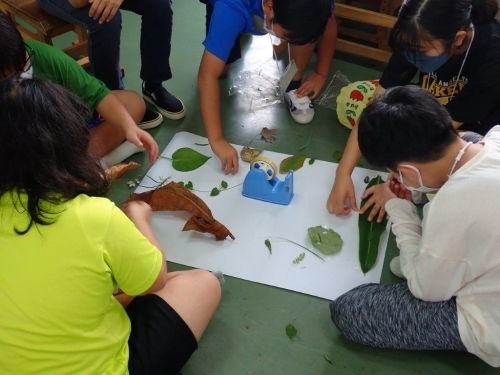 第二回は、大学でやんばるの森を研究していた大嶋ARに担当してもらい、校庭の植物から森の機能まで、普段注目する人の少ない植物の世界を取り上げました。校庭の植物を使い、生物分類の基本、形態観察にゲーム形式で挑戦。葉のふちがギザギザした仲間、表面がつるつるした仲間など、子どもたちの視点で仲間分けをしてもらいました。「ヤギがよく食べる草」など、子どもたちならではのユニークな分け方もあがりました。