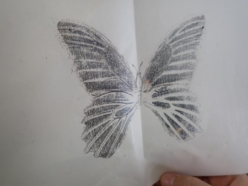 ▼紙にロウを塗り、鱗粉を写し取ります ▼きれいに写し取った鱗粉に胴体をスケッチして完成!