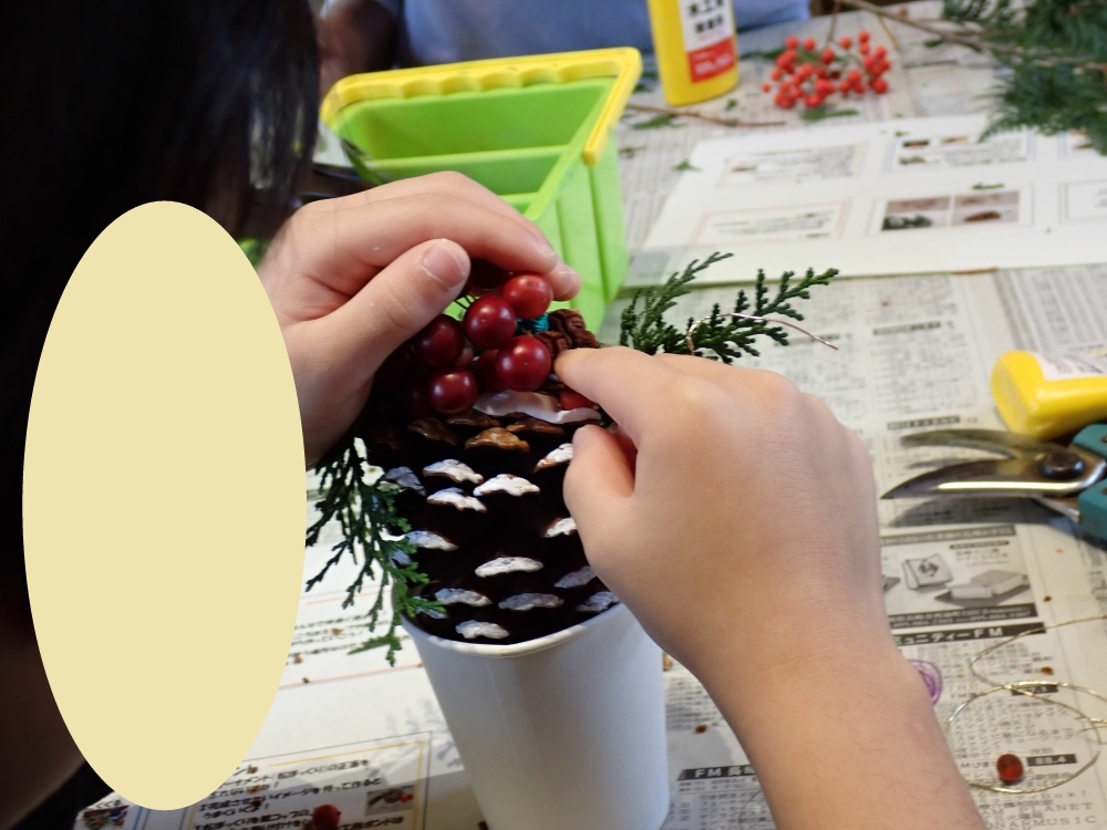 松ぼっくりのオーナメントを黙々と作りはじめる子もいれば、保護者の方と協力して作っている子もいました。中には、保護者の方が思わず熱中してしまう場面も見られました。