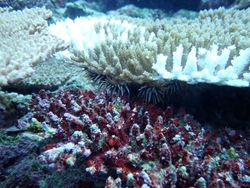 オニヒトデは夜行性のため、日中は岩陰にかくれています。オニヒトデの捕食痕をたよりにテーブルサンゴの裏など陰になっている場所をよーく探していきます。