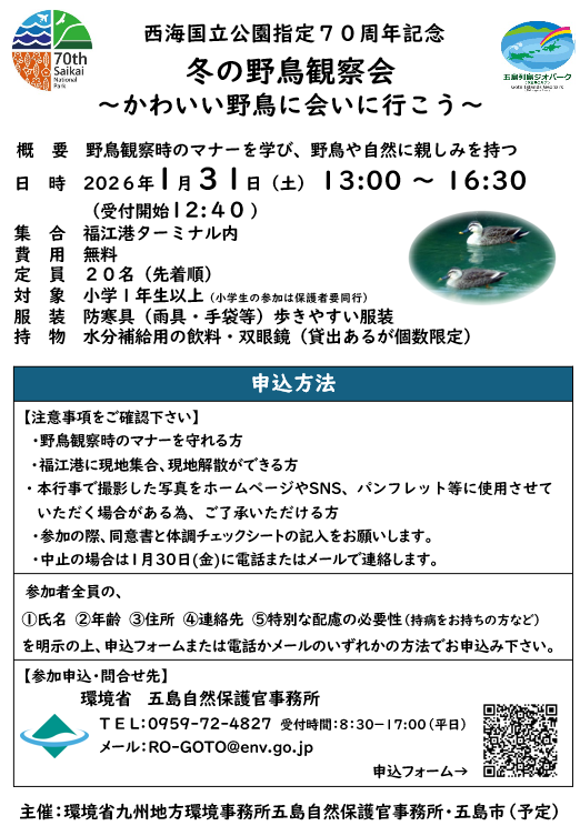 1月31日に「西海国立公園指定70周年記念 冬の野鳥観察会~かわいい野鳥に会いに行こう~」を開催します。