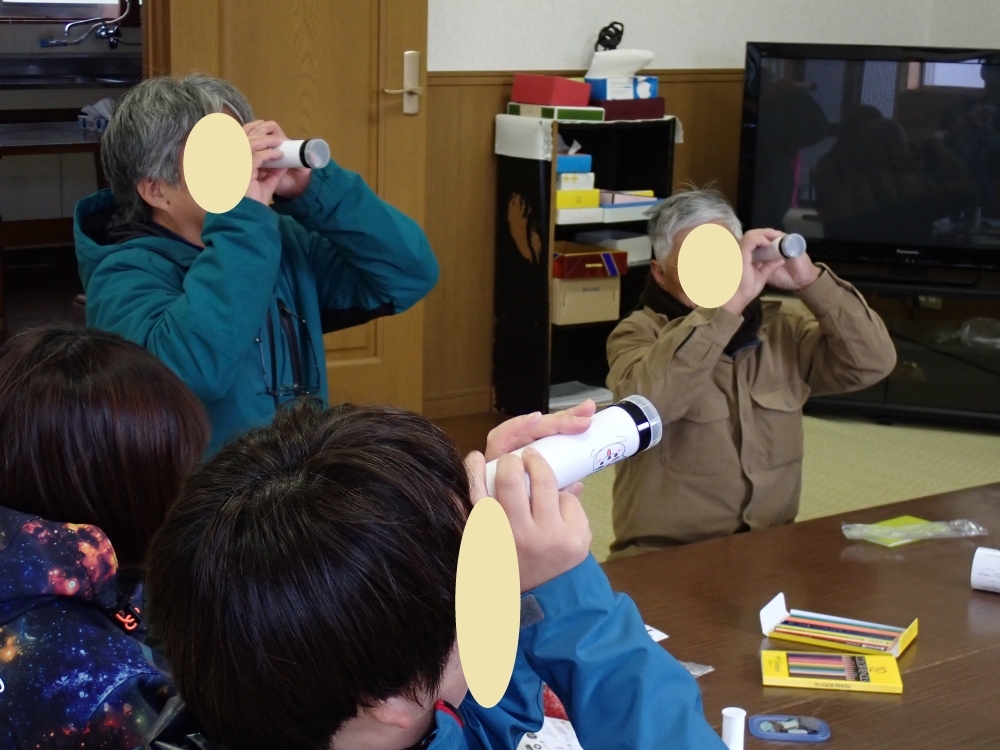 そして、万華鏡のキットを組み立て、集めた素材を入れ込むと…世界に一つだけの素敵な作品が次々と出来上がり、互いに見せ合いながら楽しむ姿が見られました。