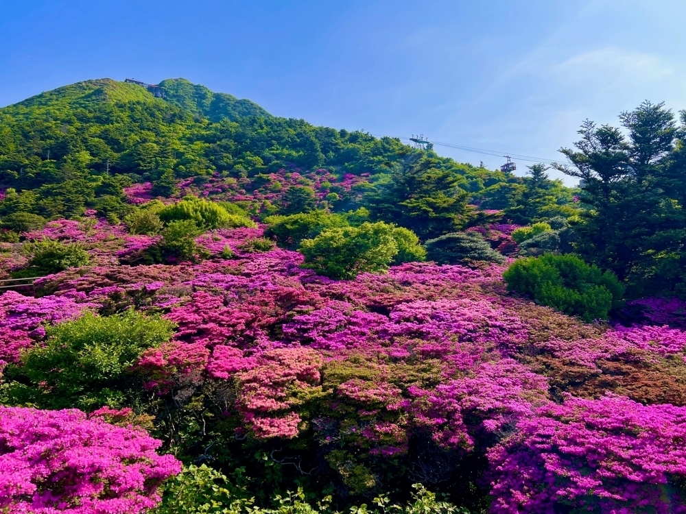 登山当日の5月15日(月)、仁田峠では青い空とちょうど見ごろを迎えたミヤマキリシマが待ってくれていました。 気温もちょうどよく最高のコンディションで、九州大学地震火山観測研究センターの松島教授を先頭に平成新山の頂上を目指し出発しました。