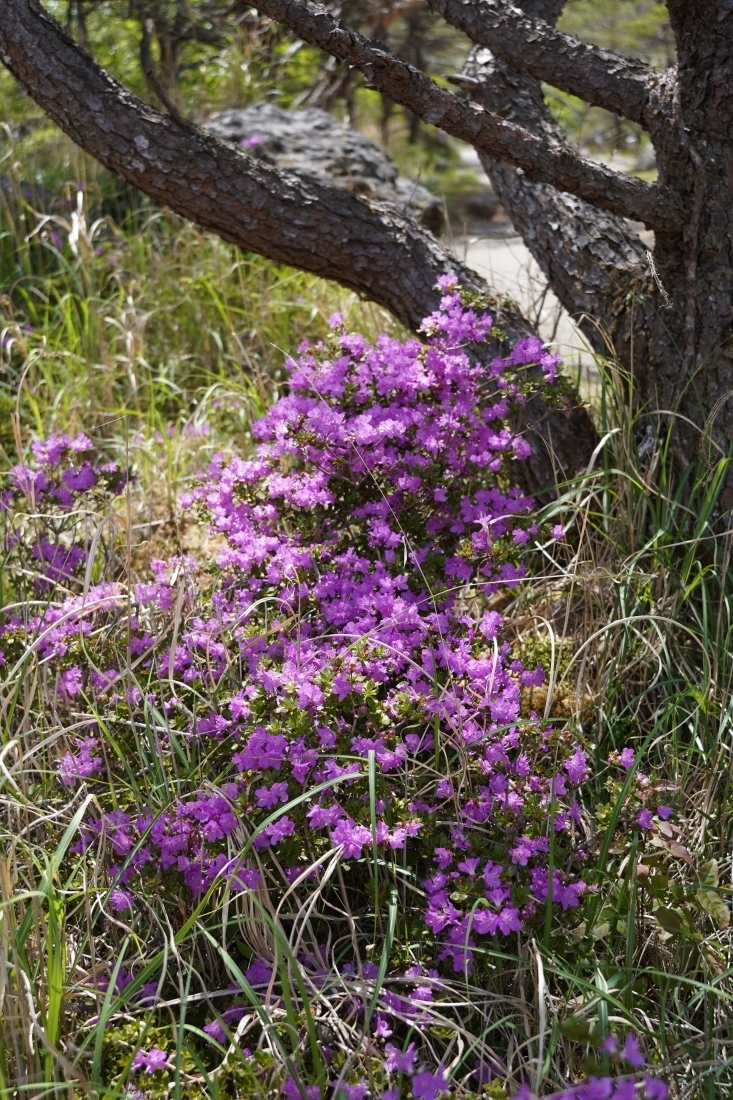 登山者カウンターデータ回収途中で、赤松のそばで育つミヤマキリシマが目にとまりました。