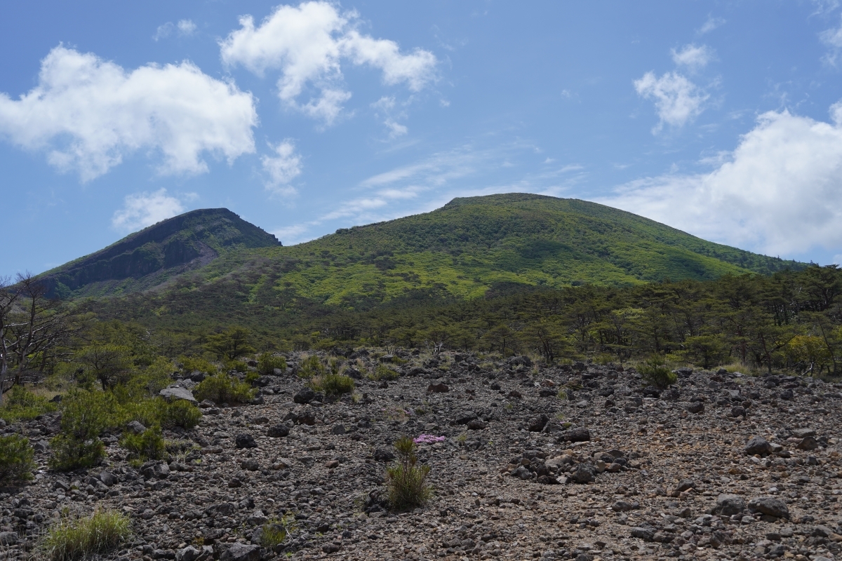 韓国岳が目の前に見えるガレ場が残る園地