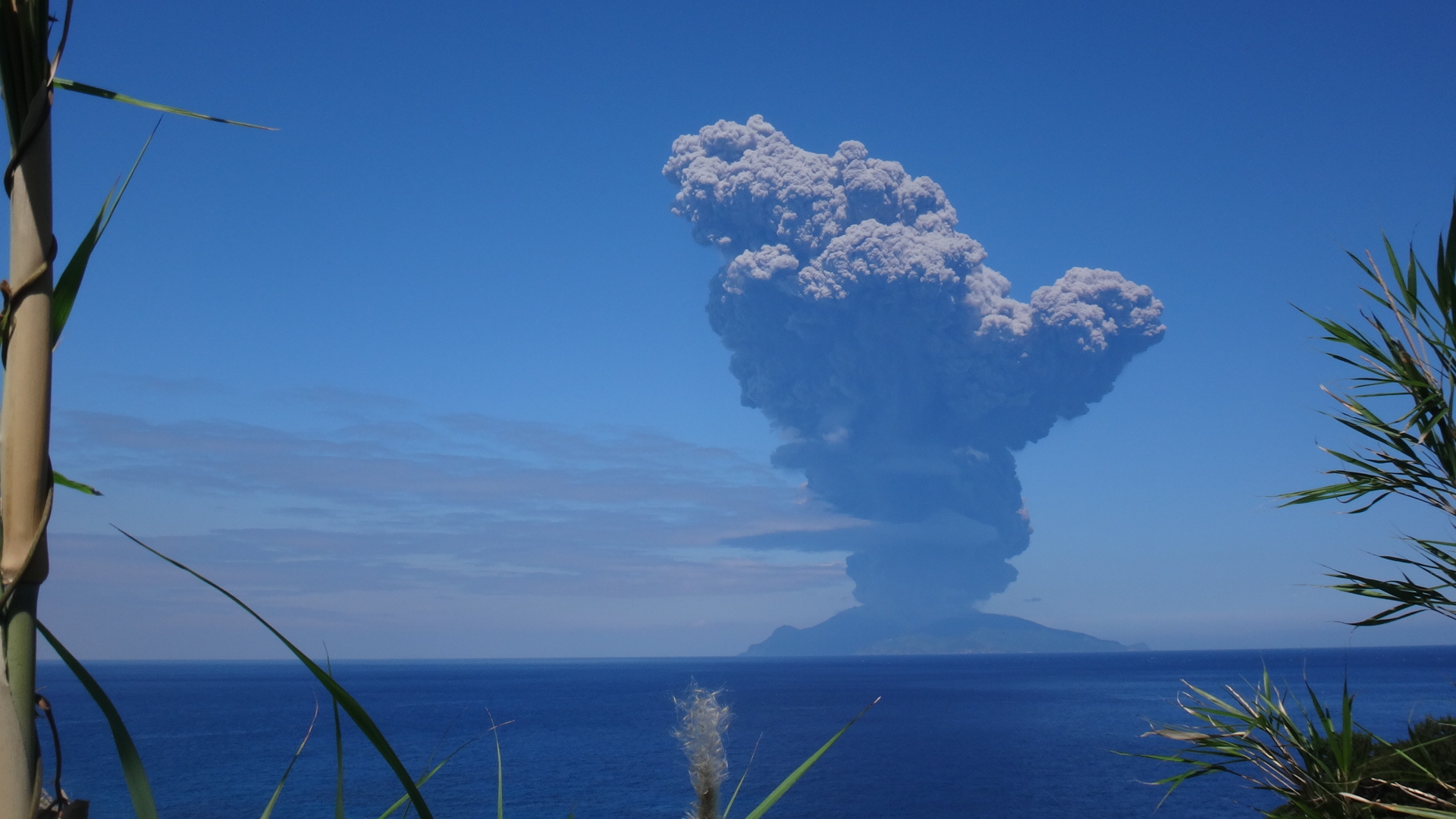 島の南東部中央には2015年に爆発的噴火が発生した「新岳」がいまなお噴煙をあげています。