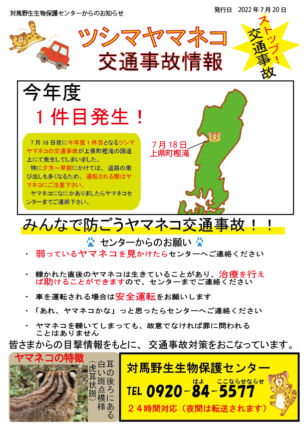 つい先日、実際にあった連絡です。みなさんこんにちは、対馬自然保護官事務所の金子です。今回は対馬のアクティブ・レンジャーはじめセンター職員がおこなっているツシマヤマネコ(以下ヤマネコ)の救護活動についてお話したいと思います。センターではヤマネコ保護のため、通報があれば24時間365日対応しています。
