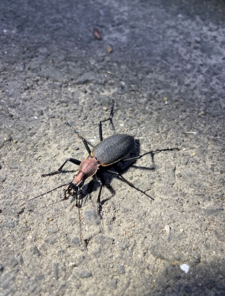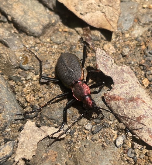 マイマイカブリという本土に生息するオサムシ科の昆虫の仲間で、写真のように地べたを歩き回り、食べ物を探します。
