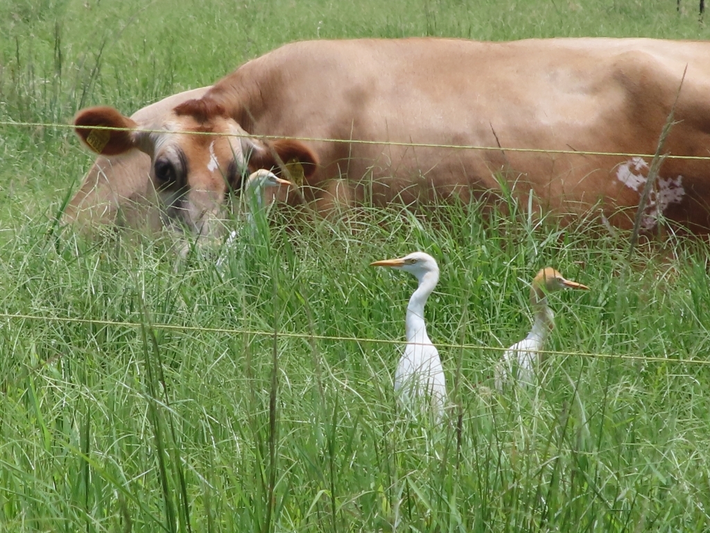 牛の近くにサギの仲間がいました。手前にいる白いのはチュウサギ、両隣にいるアマサギは夏羽に生え替わっています。牛が動くと草むらにいる虫が飛び出してくるので、エサをねらって牛のまわりに集まってきます。