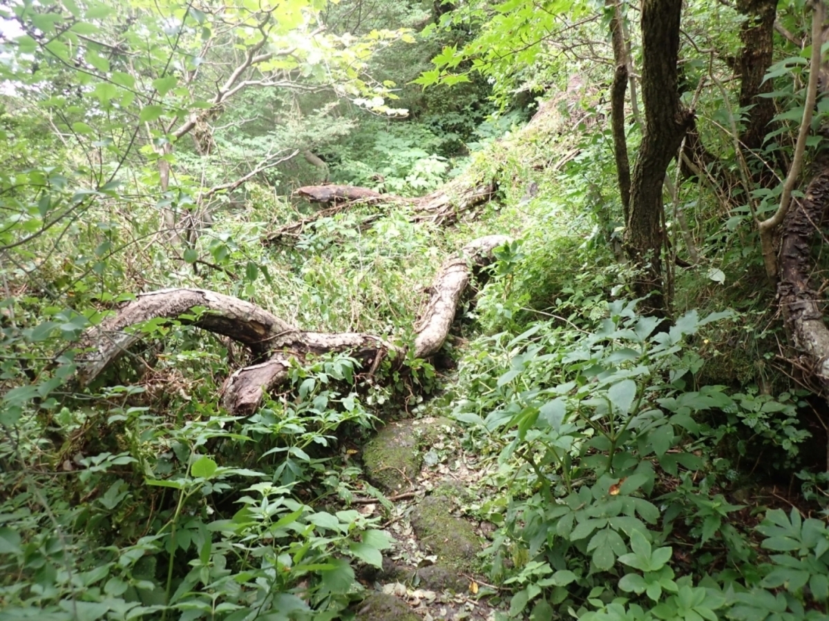8月に施設の状況を調査しましたが、その直後に登山道で倒木が発生しました。根元は直径50㎝以上ある大木で、草刈と合わせて、専門の業者に対応していただくこととしました。徒歩でしか行けない山の上で、なかなか依頼先が見つかりませんでしたが、ついに快諾をいただき、対応を終えることができました。