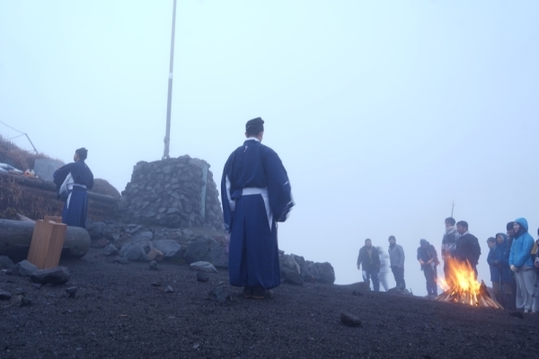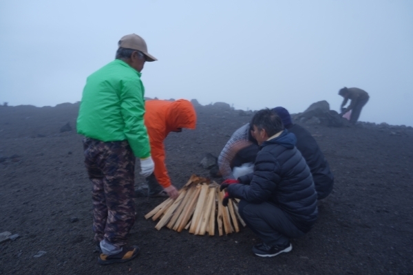 山頂に到着すると肌を刺すような冷たい強風が吹き付けるので着込んだりするなど防寒対策を再度しっかります。その間すでに待機していた方々で、御神火を焚くための準備が行われます。