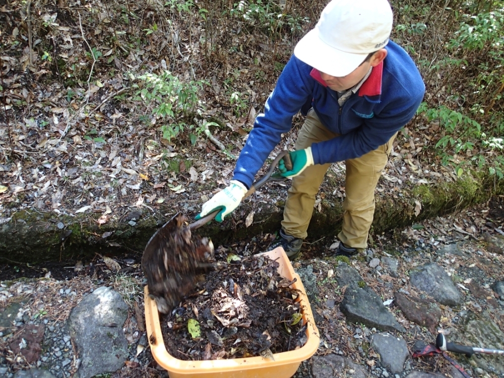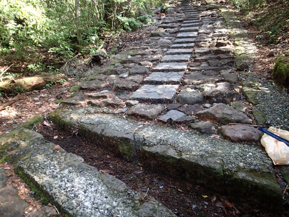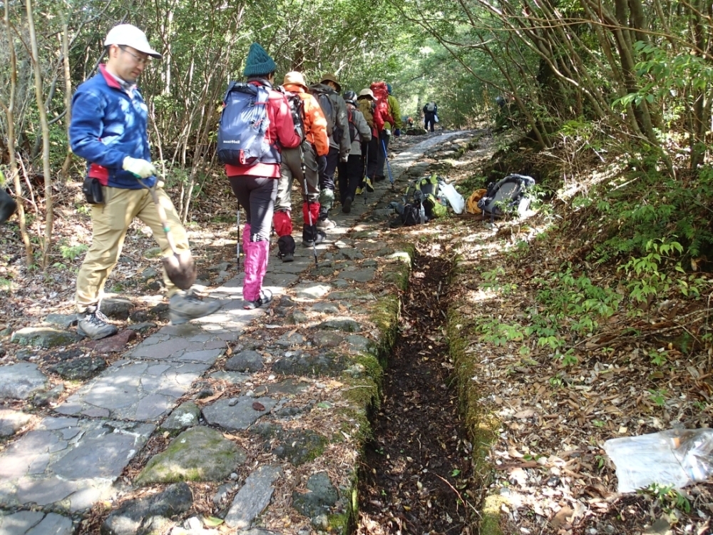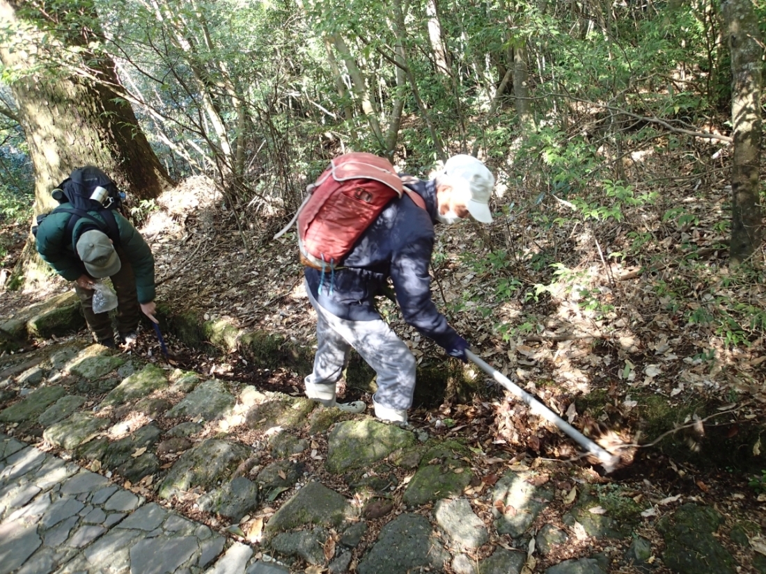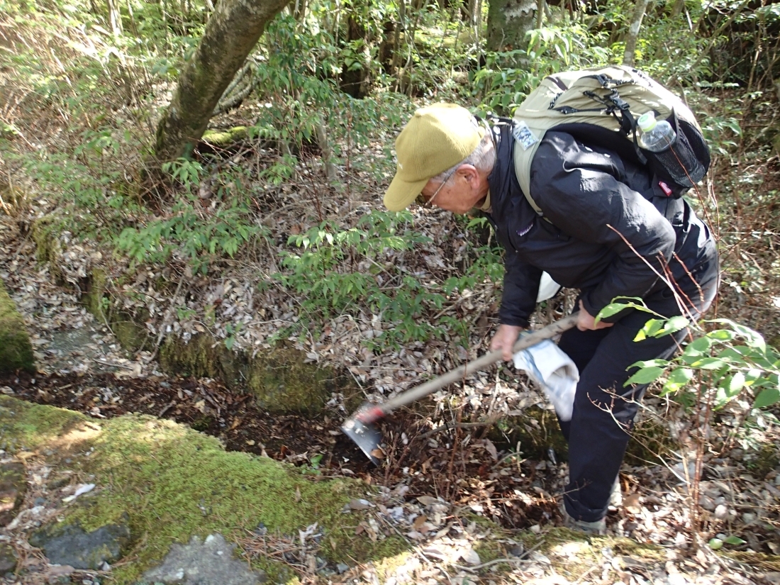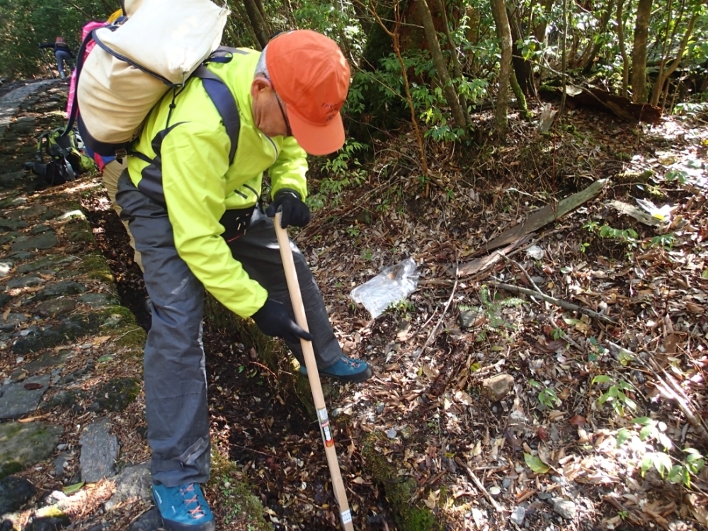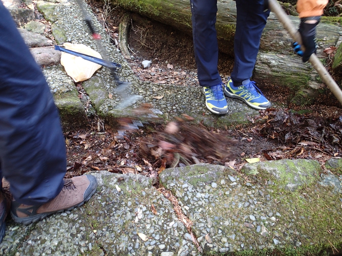 登山道の脇にある標識や案内板の拭き掃除や、登山道の途中、途中に見られる溝に溜まった土や、落ち葉の掃き出し作業、ゴミ拾い等を行いました。