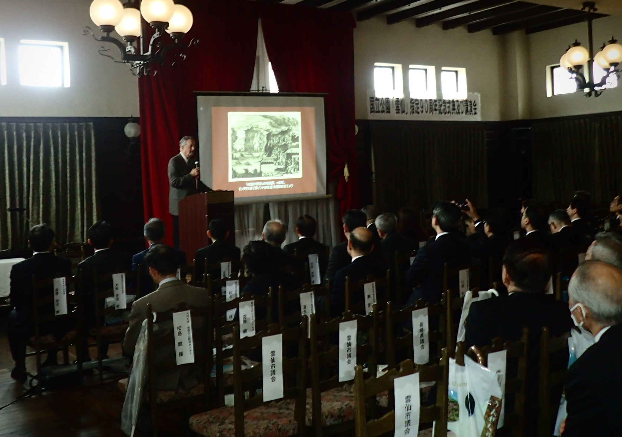 講演会では、長崎や雲仙の歴史を研究するグラバー園のブライアン・バークガフニ名誉園長が記念講演をされました。明治から昭和の初め(戦前)まで、居留外国人にとって雲仙は、東アジアにおける憧れの避暑地であった、と雲仙の歴史を語られました。