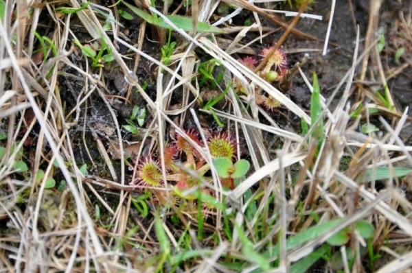 赤くトゲトゲしているように見える植物がモウセンゴケで、先端から粘液をだして虫を捕まえる食虫植物です。