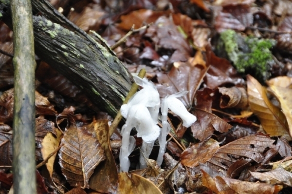 林床では雨の水滴がギンリョウソウを輝かせていました。別名はユウレイタケと呼ばれているそうですが、白く透き通っていて妖精の羽根のようでした。