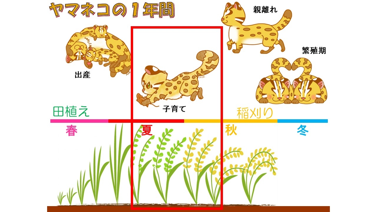 第二にヤマネコが子育てをする時期には丁度田んぼの稲が成長し「隠れ場所・休憩場所」としての役割も果たしてくれます。(右図参照)
