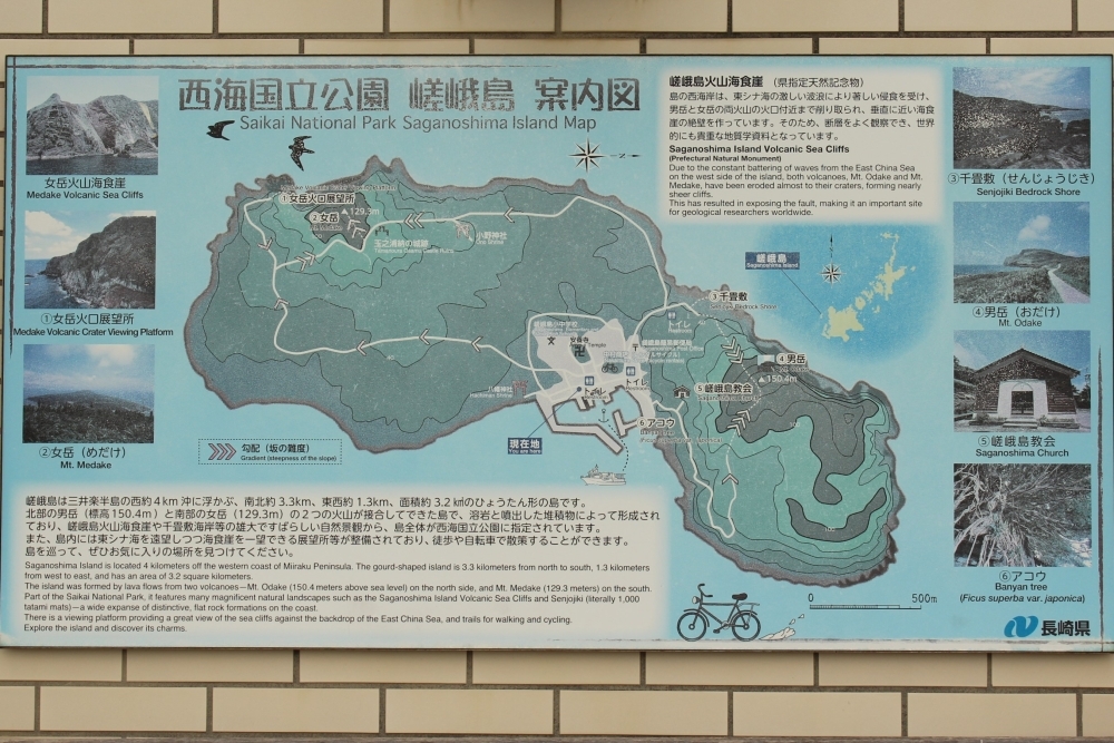 嵯峨島は福江島の三井楽半島の西約4㎞沖に浮かぶ、面積約3.2㎢のひょうたん形の島です。