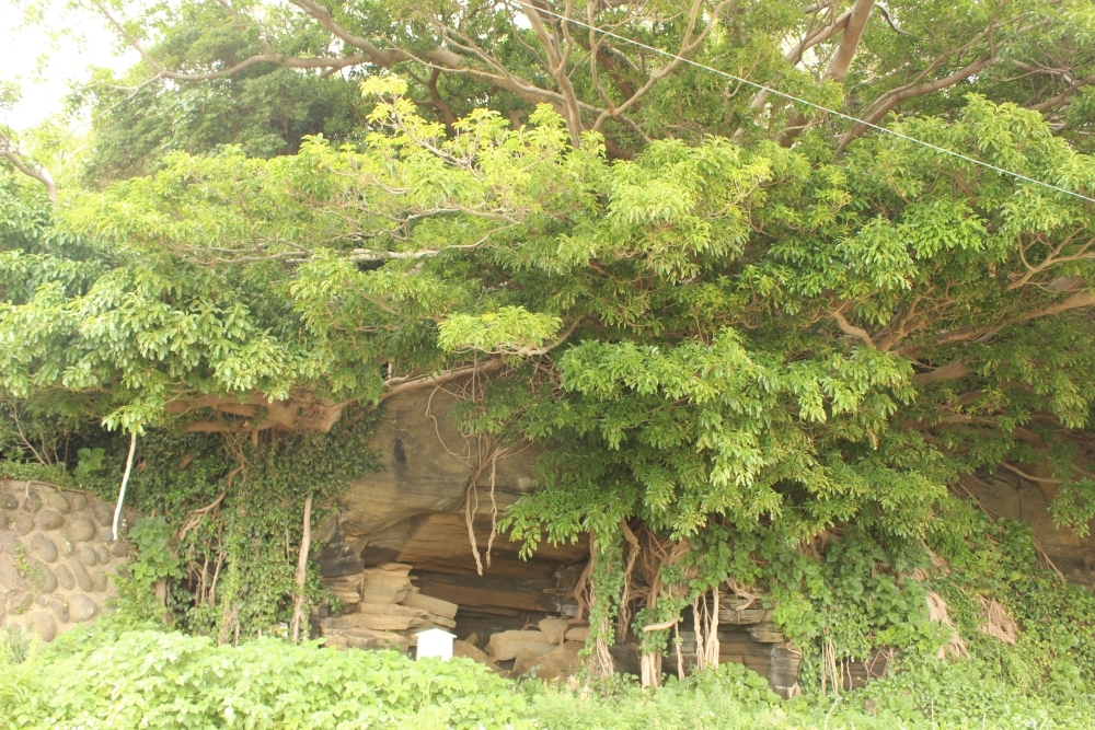 火山からの噴出物が堆積し、縞模様になった崖に、アコウの根が複雑に張り付き下に垂れている状態です。