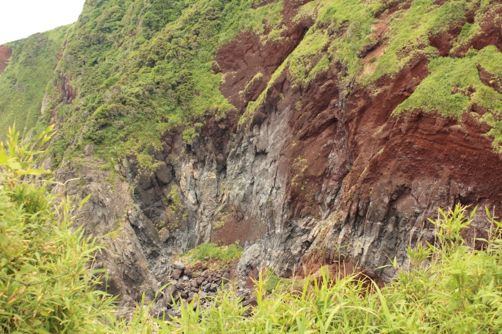 赤色は火山の噴火によって飛ばされてきた岩石で、灰色は溶岩であり、それらが層になっています。