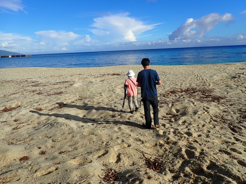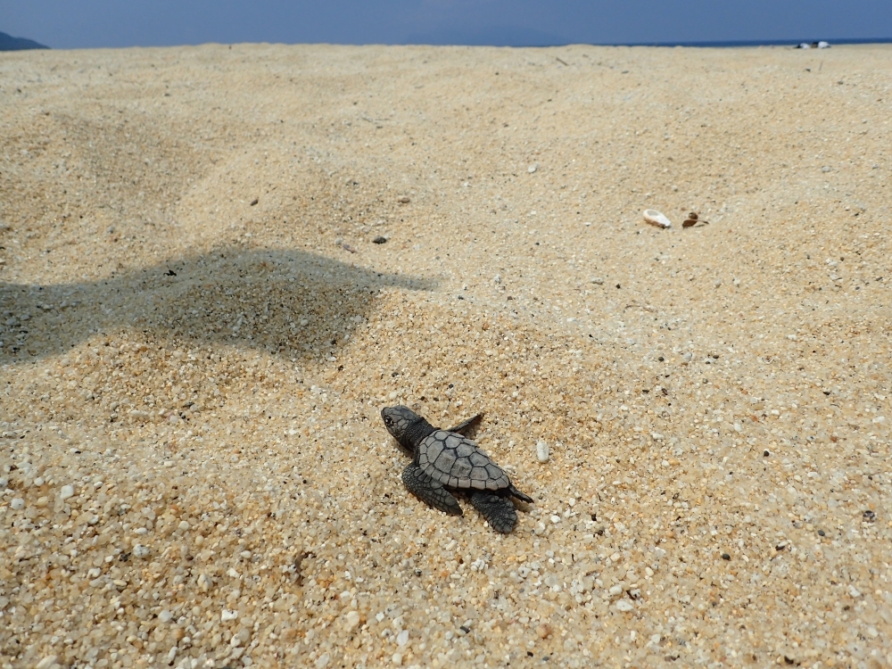 ふ化期に入ると、暗い砂浜を巣から脱出した子ガメが月明かりを頼りに海に向かいます。踏んでしまったり光で方向が分からなくなるなど、帰海の邪魔にならないよう浜へ立ち入らないようご協力お願いします。