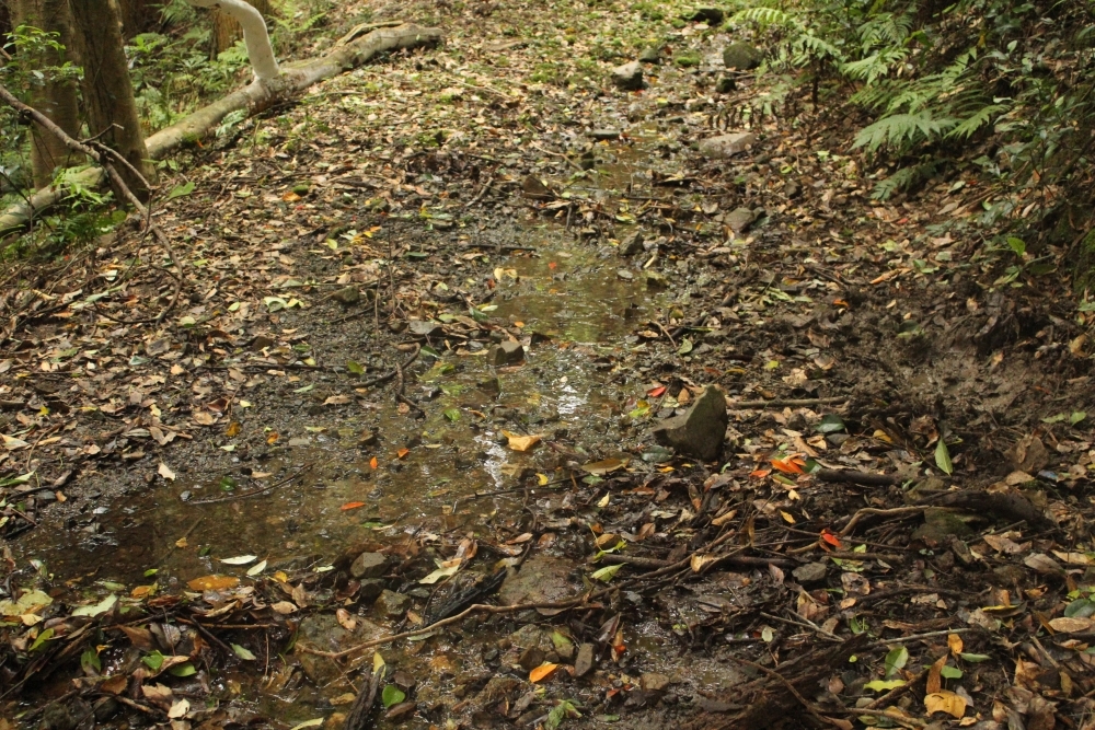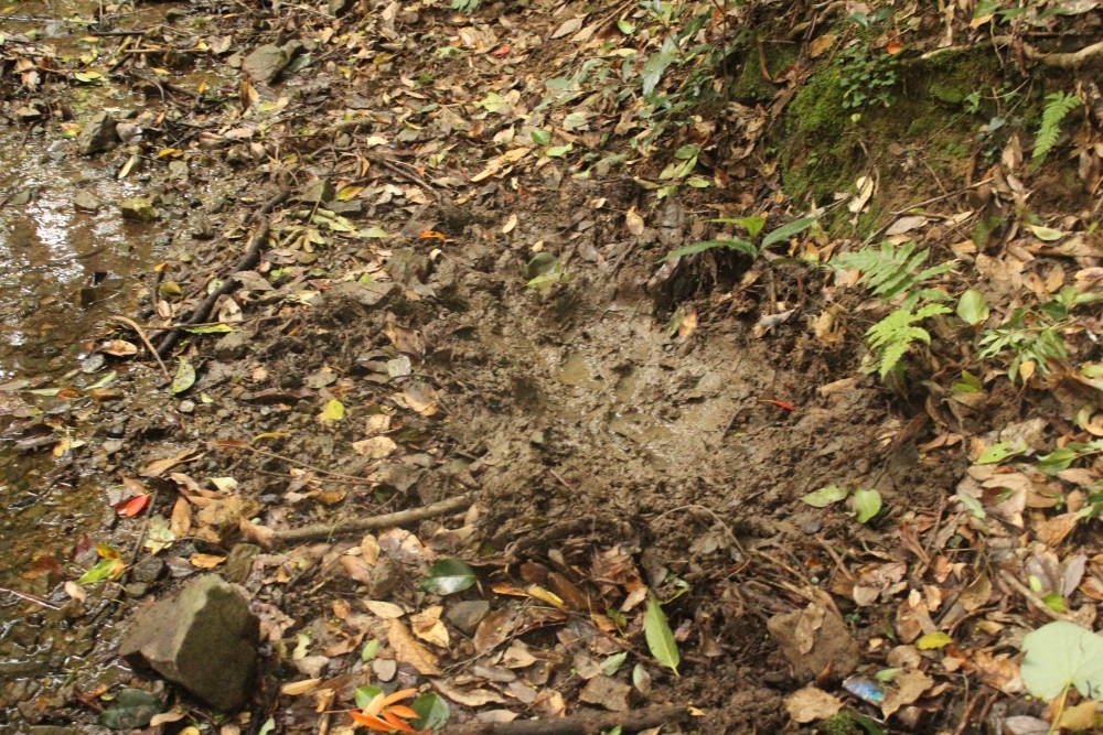 歩いて10分もしない間にイノシシのぬた場を確認しました。