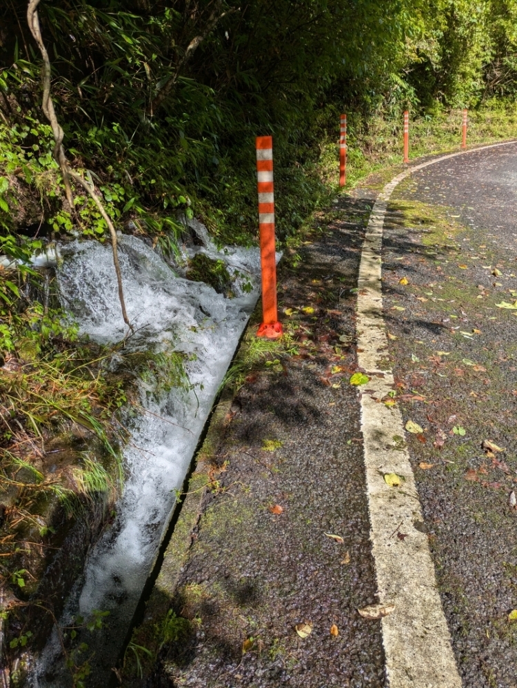 道路脇の側溝へと溢れそうになるくらいの水が、山の方から流れてくる様子