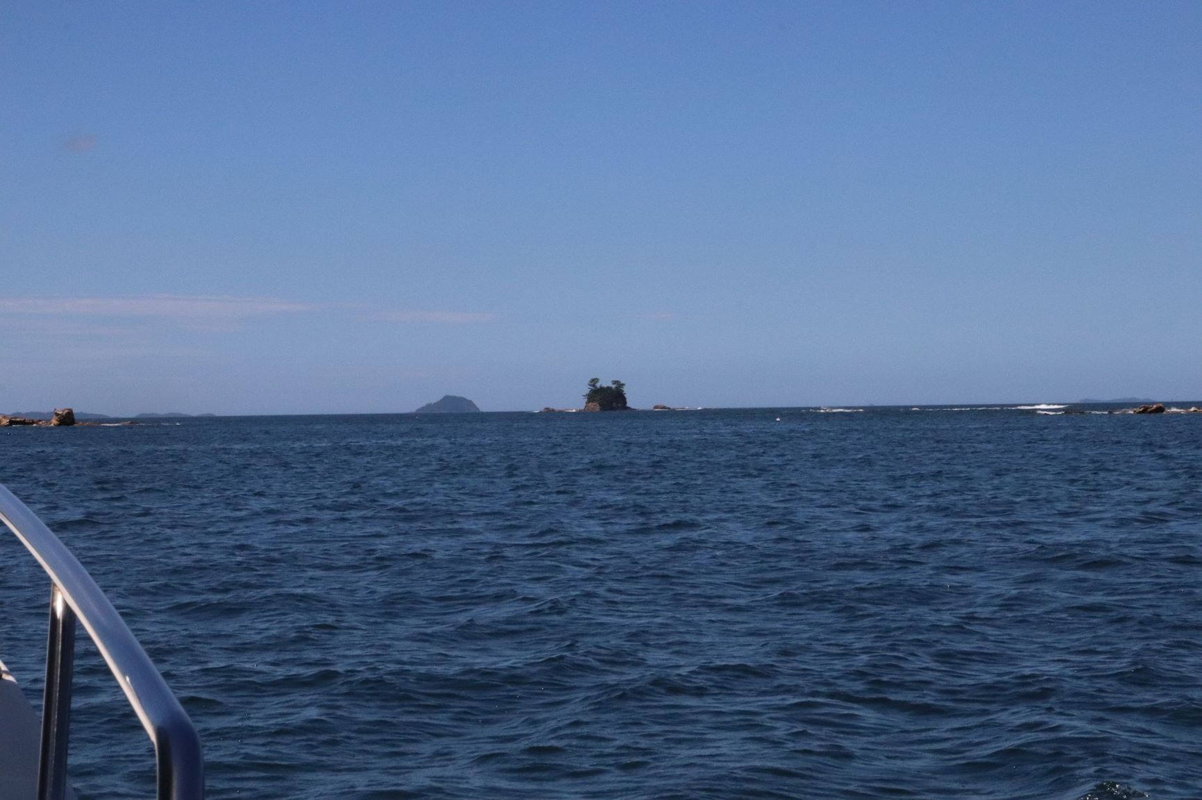 風が強く、海がそこそこ荒れていて上陸できそうにないとのこと。