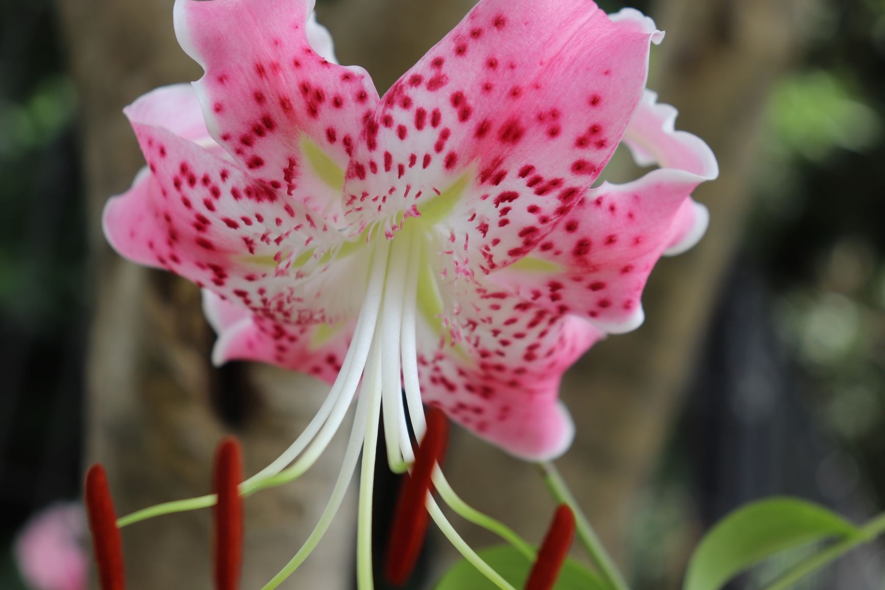 色は濃いピンク色で、深紅の斑点模様(鹿の子模様)が特徴的で、夏の景色に彩りを添えています。