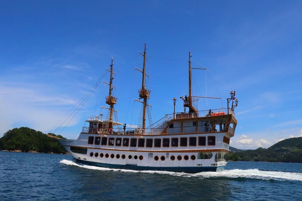 夏空ひろがる快晴、そして猛暑の中、九十九島の島々に自生する「カノコユリ」という植物を調査するため、「かのこゆり」という船に乗って出発しました。