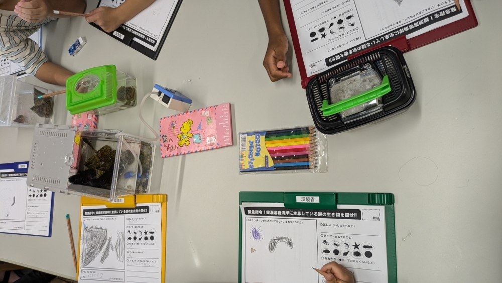 自分たちでつかまえた生き物を観察し、自由に描いていました。