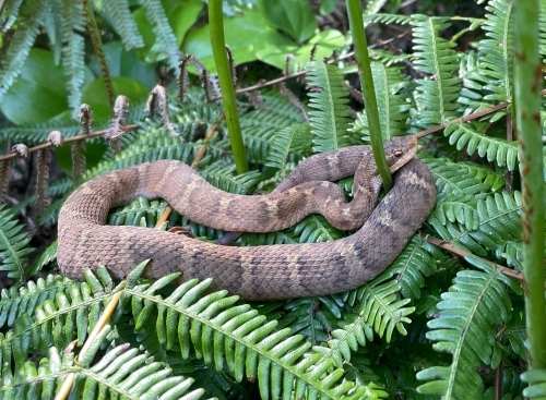 日光浴中でしょうか?シダの上で初めてヘビを見かけました。