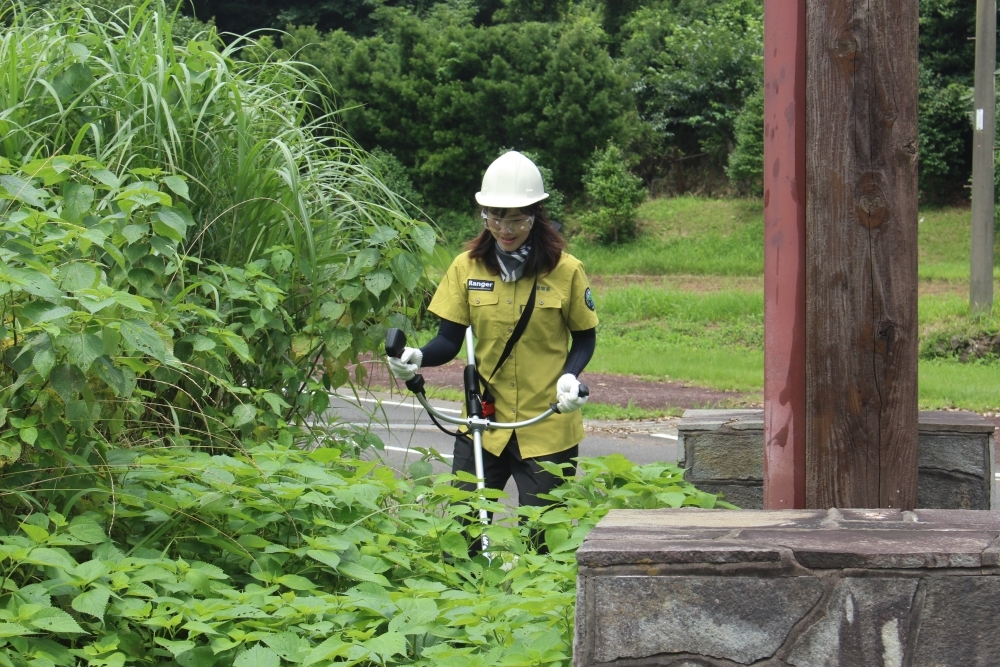九州自然歩道沿いに設置している標識やベンチ等の周りの草刈りを行っています。